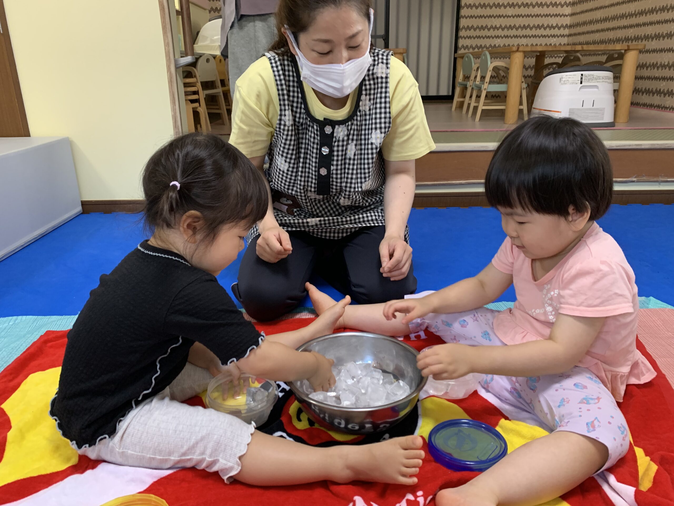 9月から新入園の2名が加わり、ますます賑やかになりました。新しいお友だちもだんだん園に慣れ、自分からおもちゃに手を伸ばして遊んでいます。在園児さんも仲よくなりたくて、お顔をのぞきこんだりして、ほほえましい場面が見られます。
