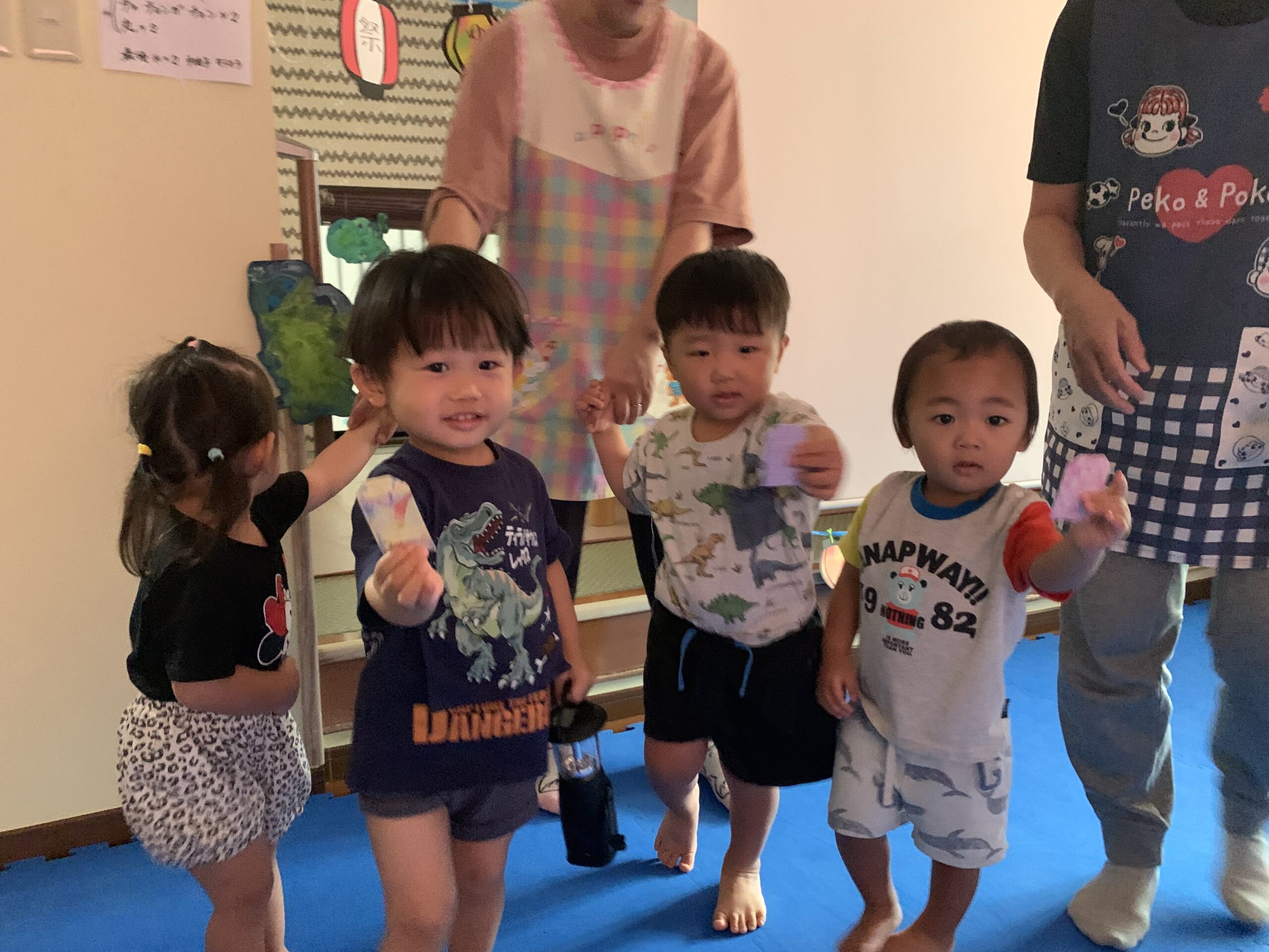 今月はお散歩に出るにはまだ暑く、室内あそび中心となりました。お絵描きや布あそびなど様々な活動の中で、ブロックあそびが定番の人気です♪