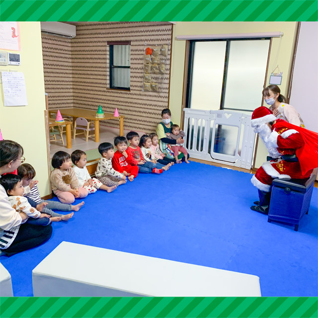 クリスマスの歌や手あそびに親しんできたこどもたち。ツリーやリースを飾って、いよいよクリスマス会。『森のクリスマス』のパネルシアターを観た後、リンリン・・・鈴の音が。サンタクロースが来てくれました!